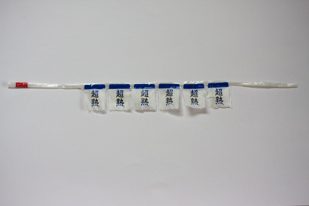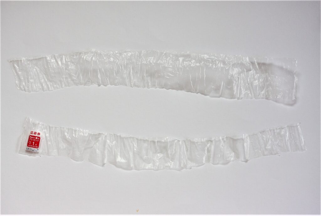 - 2本のひもを作ります。(面倒な方はひもを使ってもOK)超熟と書かれた下の部分を写真のように切ります。