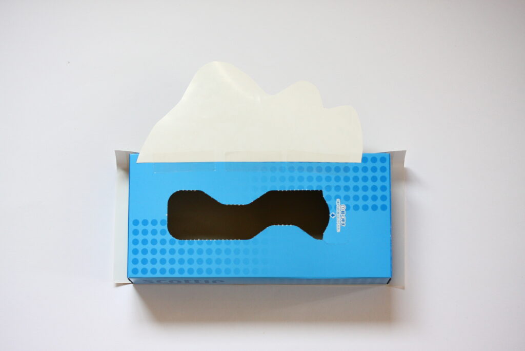 - ティッシュの空き箱の薄い面にはさみで十字を描くように切り込みを入れるか、ボールペンでぐりぐりと穴をあけます。